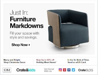 As you can see below, Crate & Barrel has a small “Get Social With Us” section at the bottom of their emails. In it are social buttons of all the social channels they’re in, letting their subscribers follow them on whichever platform they prefer.